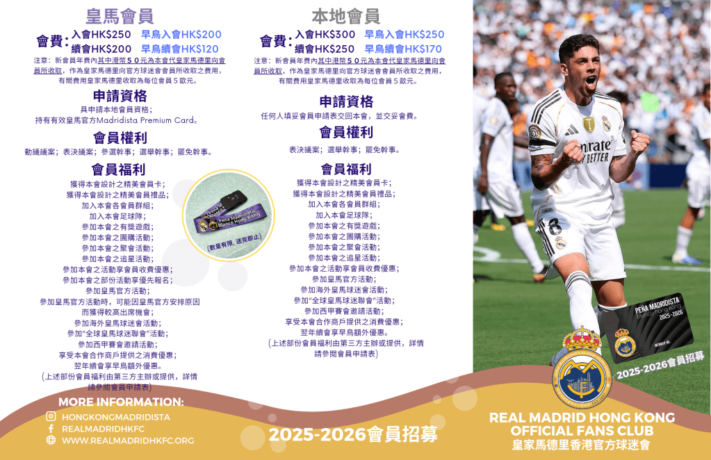 新會員早鳥入會會費優惠(10/8/2025前入會):皇馬會員$200;本地會員:$250。